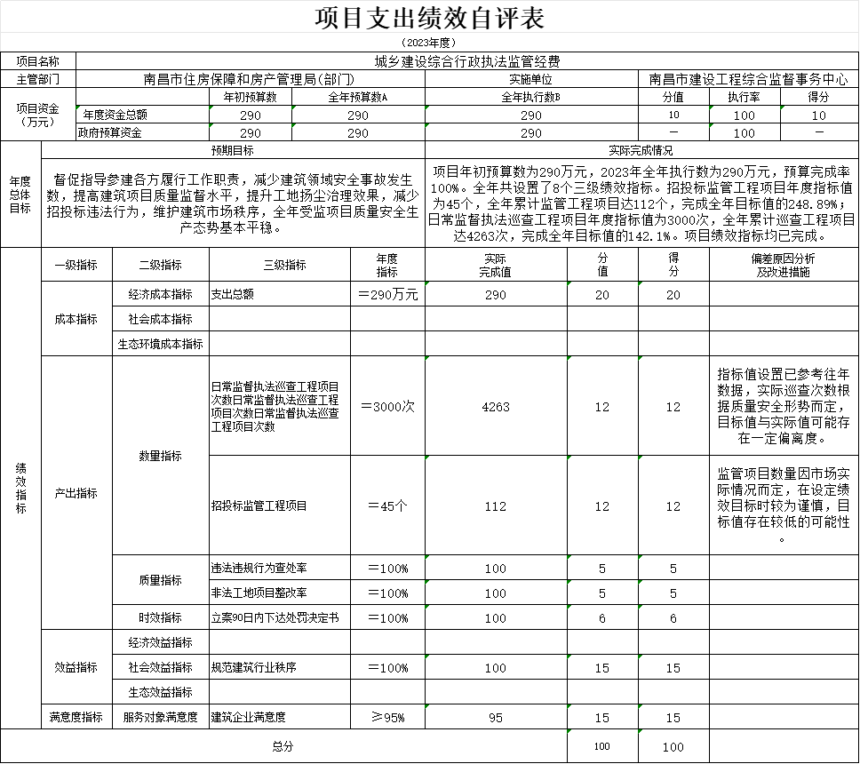 “城乡建设综合行政执法监管经费项目支出绩效自评表”如下: