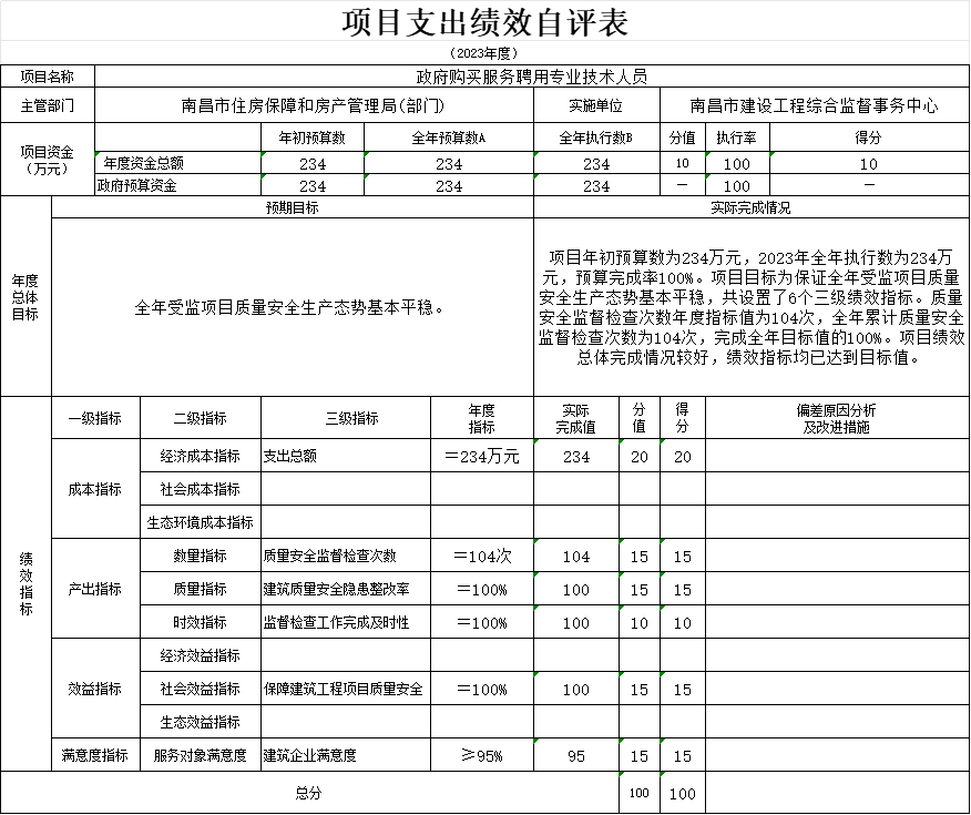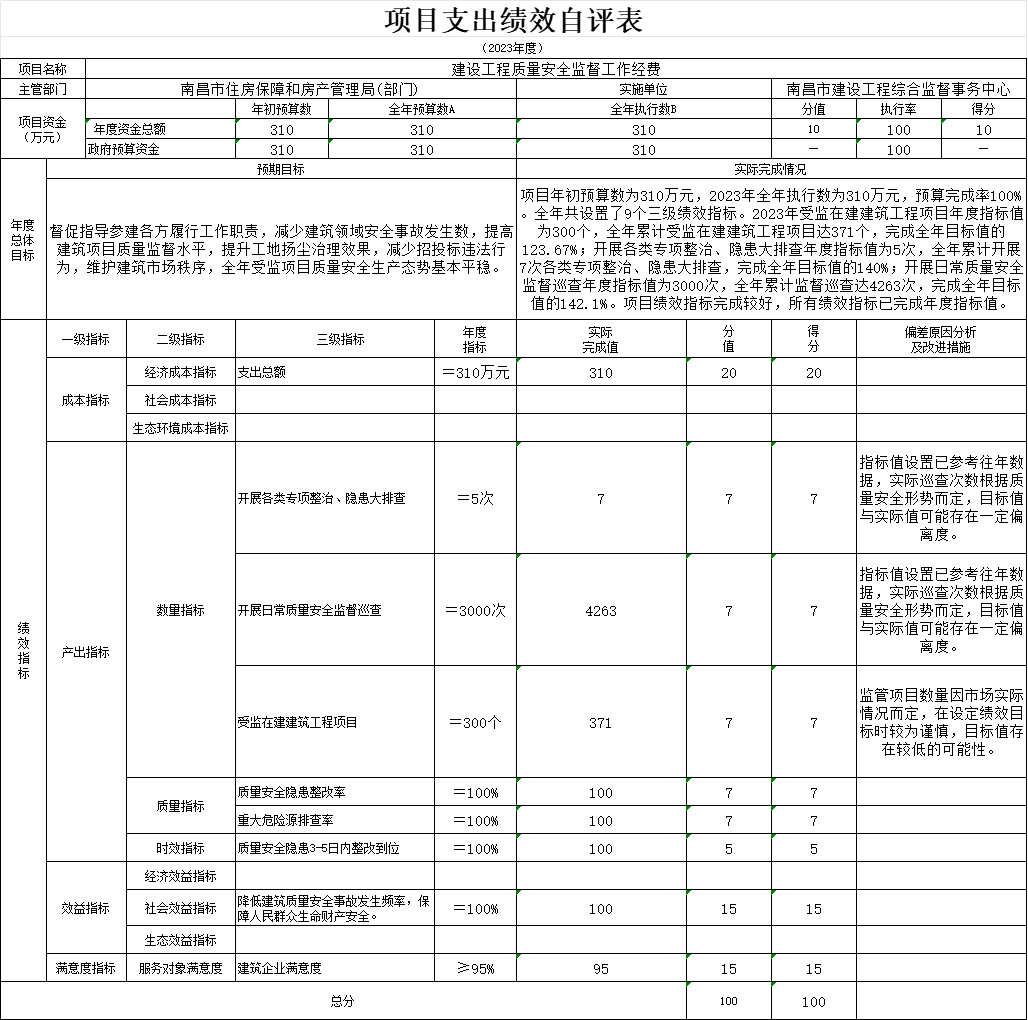 本单位“建设工程质量安全监督工作经费项目支出绩效自评表”如下: